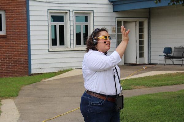 “We are in a current state of partial eclipse. We are down to just the tiniest little sliver of sunlight. In fact it looks something like the thinnest of crescent moons,” Cawthon spoke slowly and clearly, as she began the audio description of the eclipse. She used inflection in her voice as she gave account of what she witnessed through eclipse glasses.